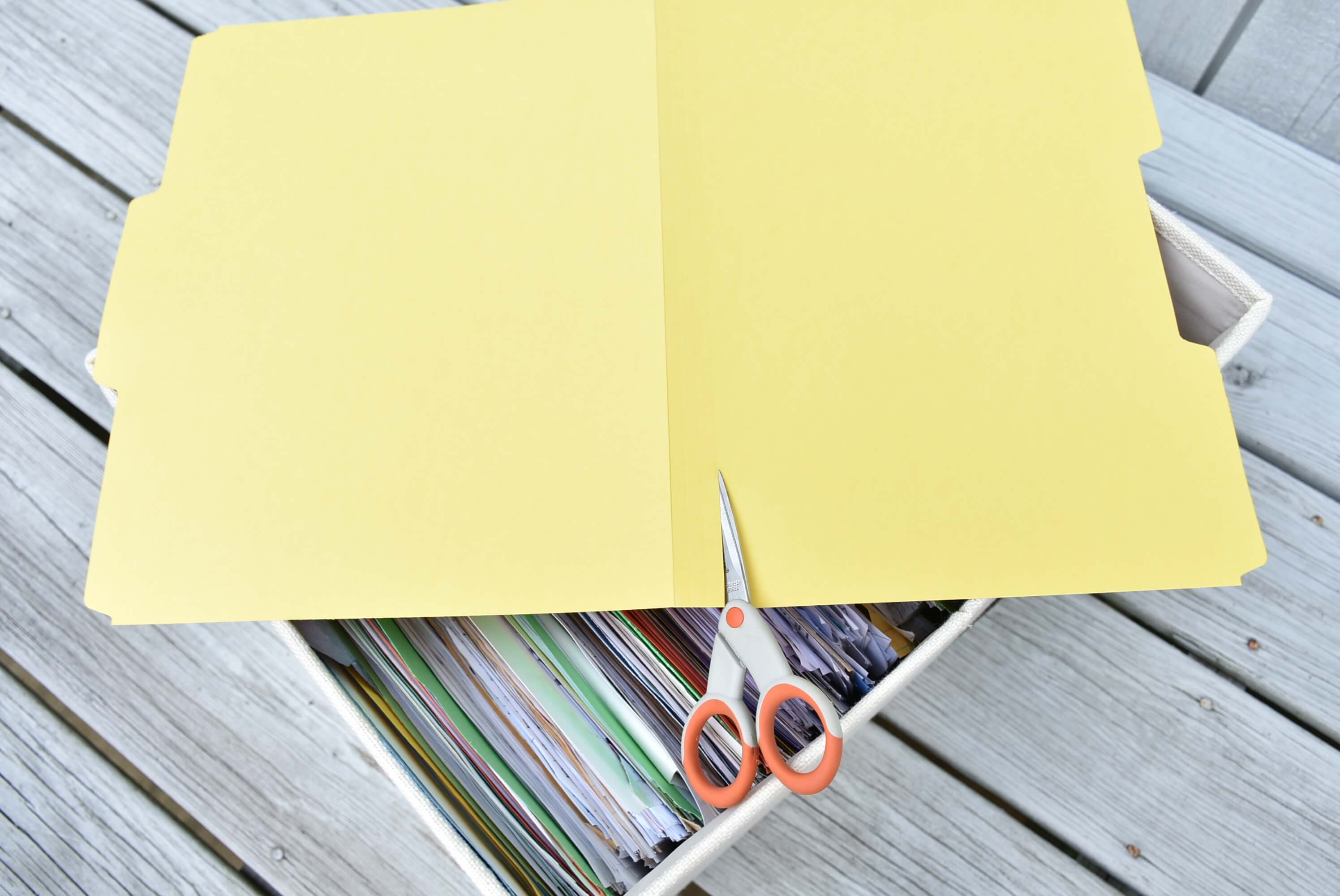 Not all of the papers were standard 8.5 by 11 so I needed to figure out a way to make the file folders visible. To make sure they were taller than the rest of the papers in the box I cut the folders along the bend lines near the fold. (You can’t see them in the photo but trust me, they’re there.)